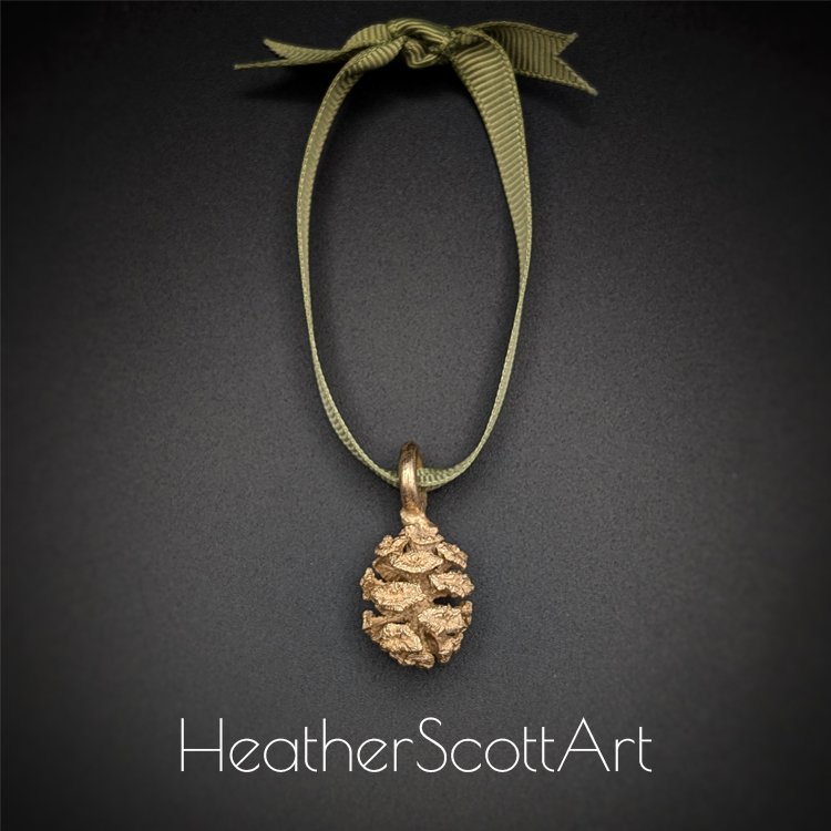 This redwood pinecone ornament hangs from a pretty green ribbon ready to adorn any tree. It is solid bronze cast from a real redwood pinecone by Heather Scott.