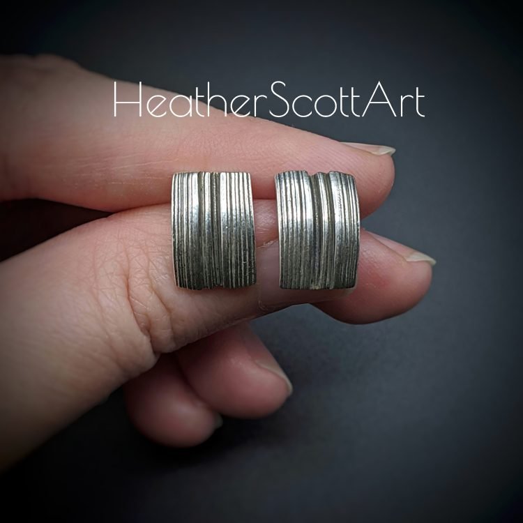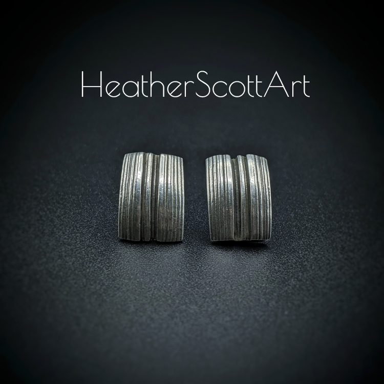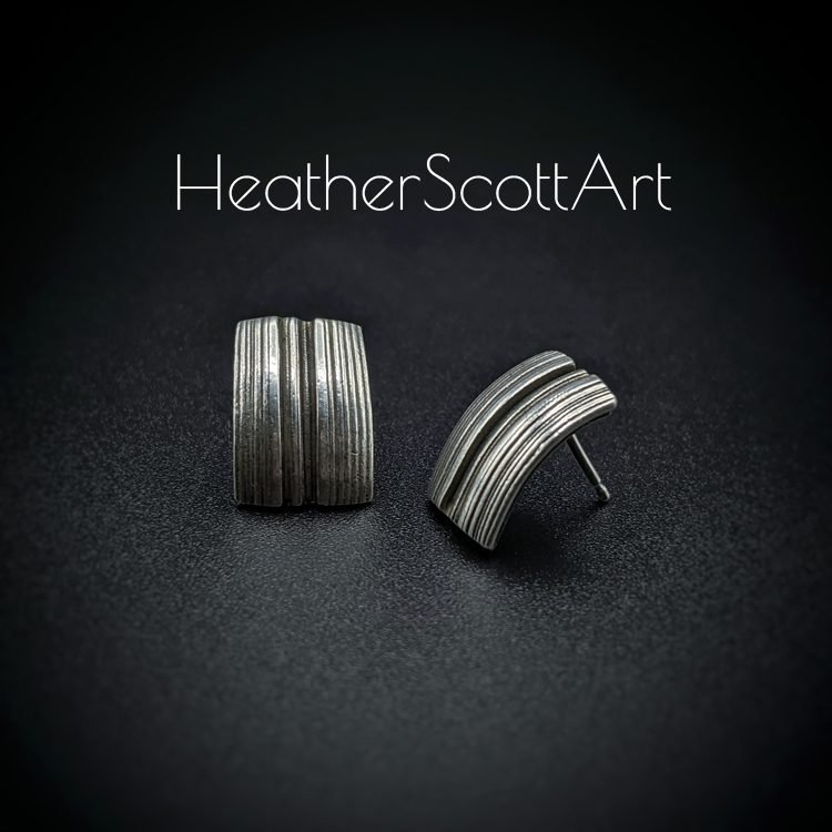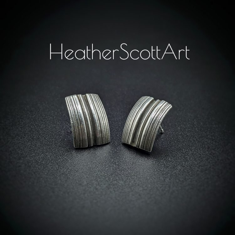 These curved mitsuro earrings were designed using the Japanese technique of mitsuro. Known for its ability to produce fluid, organic textures, this process gives these earrings their distinctive flowing linear texture and timeless aesthetic. Their minimalist rectangular form and flow give them a natural mid-century modern feel.