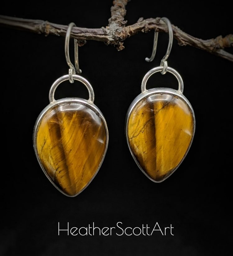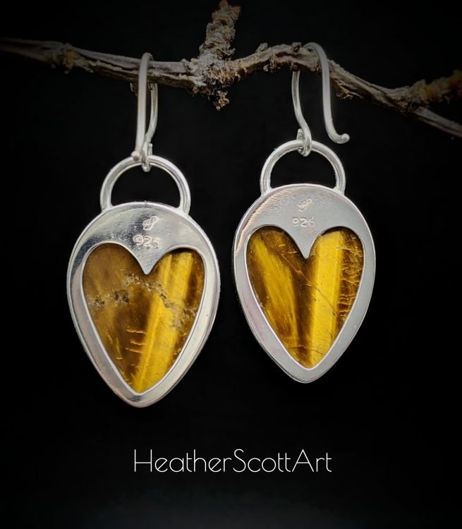 Tigers Eye earrings featuring a modern design and lovely peek-a-boo hearts on the back. These bold earrings are handmade in sterling silver by Heather Scott.