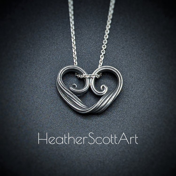 This necklace is handcrafted by Heather Scott using the Japanese technique of mitsuro. Known for its ability to produce fluid, organic textures, this process gives this pendant its distinctive flowing linear texture and timeless aesthetic. Its organic design makes it both unique and heartfelt, capturing the beauty of love in its purest form. Read about the mitsuro process in the about page.