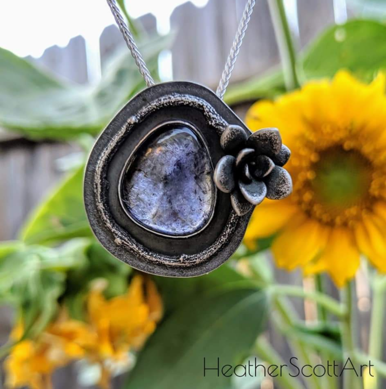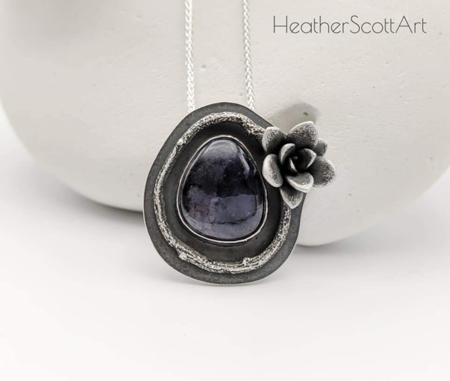 This beautiful pendent features a deep purple iolite stone framed by a plum tree branch and succulent from Heather’s garden. This solid sterling pendant, handmade by Heather Scott, is hanging from an adjustable rope chain.
