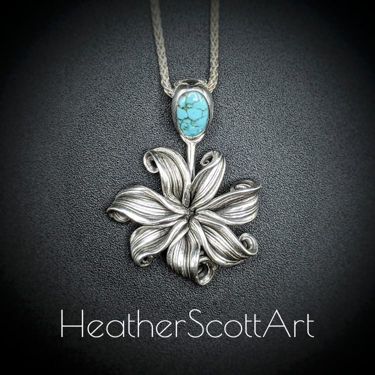 As you fasten the chain, the flower pendant settles softly against you, its flowing lines frozen in a moment of bloom. The curves feel alive, capturing the balance between delicacy and strength. A splash of turquoise set above it adds a cool reminder of blue skies on sunny days. Worn close to your heart, it’s a gentle reminder of growth, renewal, and the grounding beauty found in nature’s small details. It becomes more than something you wear; it becomes a symbol of how you’ve grown through life’s twists and turns.