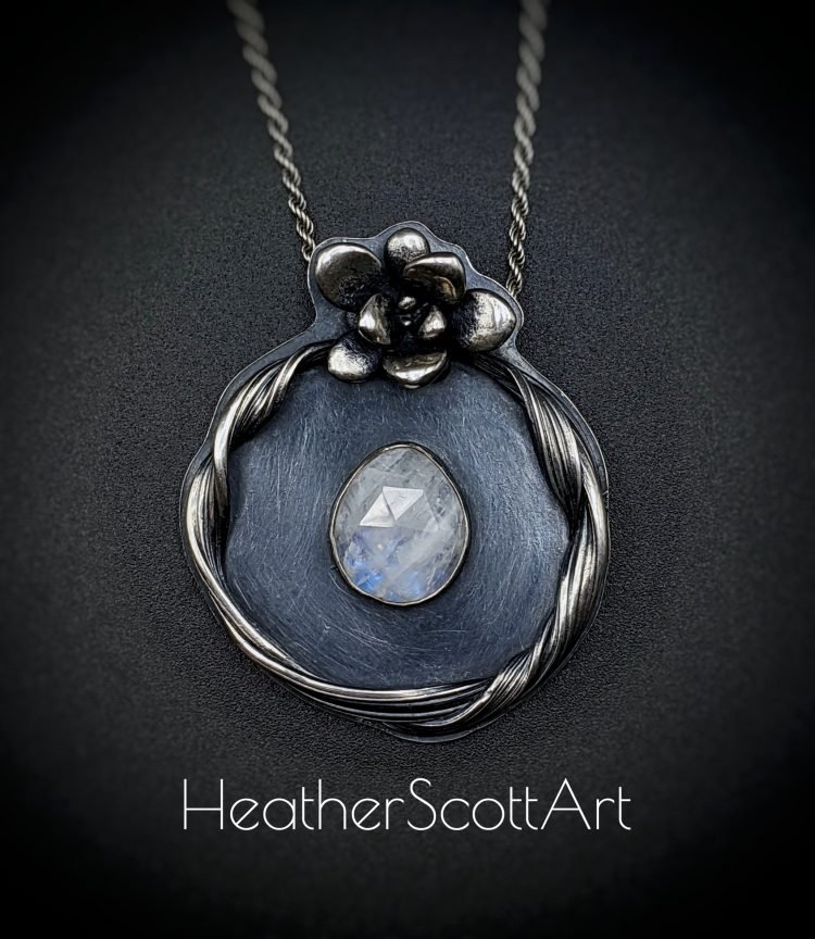 This beautiful pendent features a flashy faceted moonstone framed by a swirling textured mitsuro wreath and an aurora blue succulent.