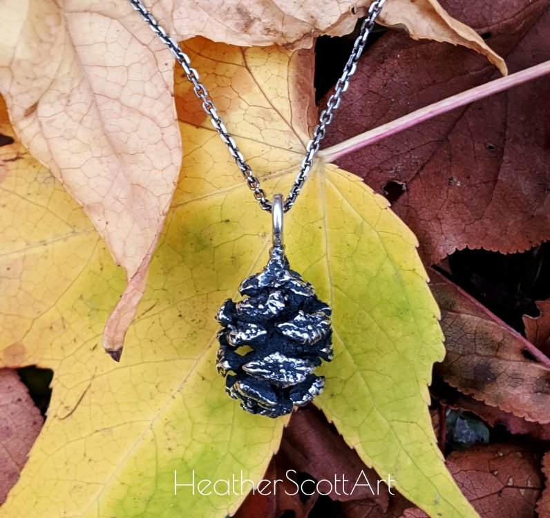 This redwood pinecone pendant hangs from an 18″ sterling silver chain. It is solid sterling silver cast from a real pinecone by Heather Scott.