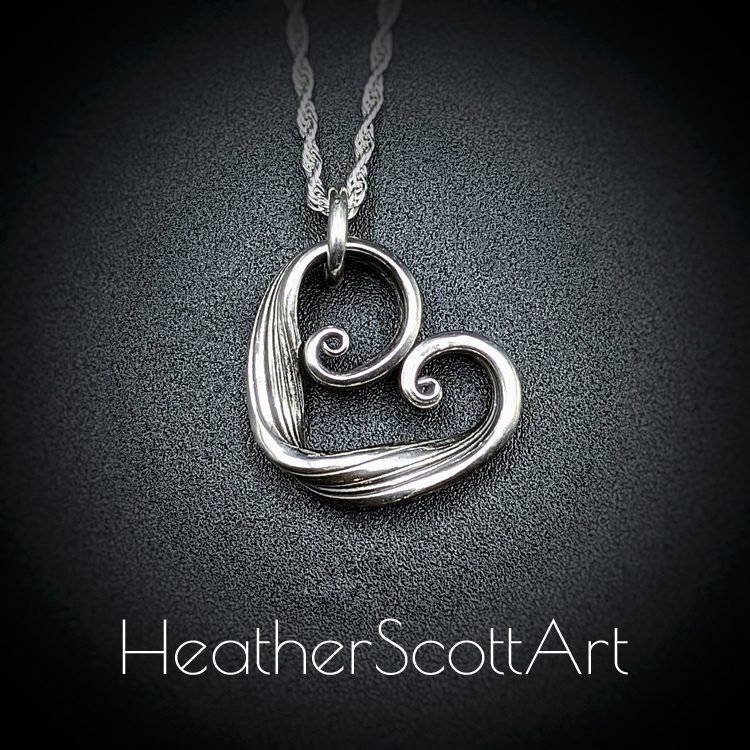 Mitsuro Heart necklace featuring natural twists and swirls. With linear textures, this sterling silver heart pendant sits beautifully on an adjustable chain.