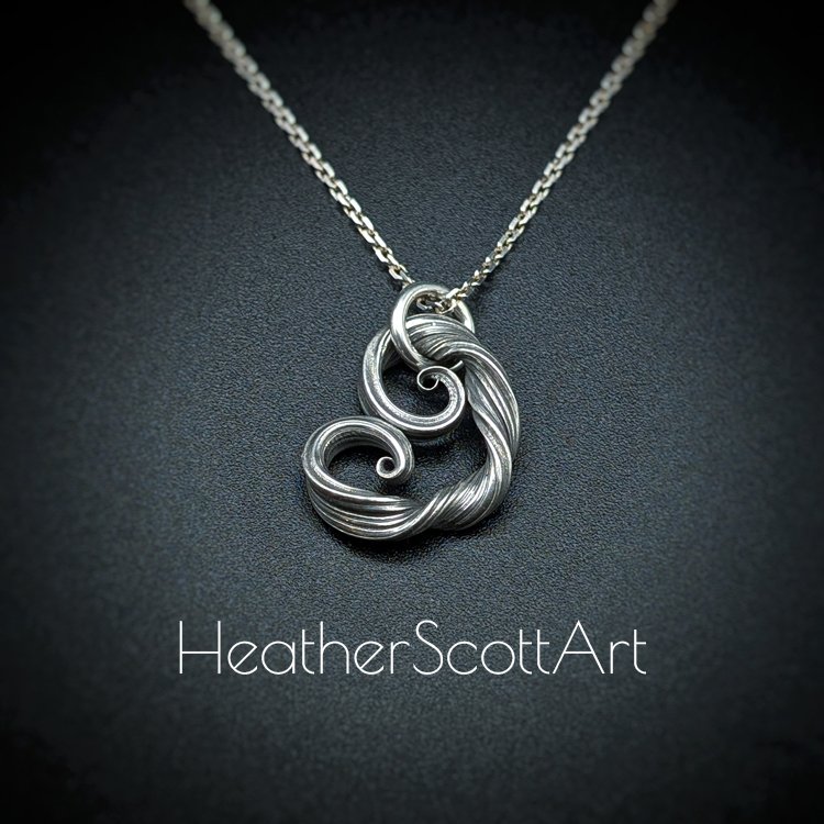 This necklace is handcrafted by Heather Scott using the Japanese technique of mitsuro. Known for its ability to produce fluid, organic textures, this process gives this pendant its distinctive flowing linear texture and timeless aesthetic. Its organic design makes it both unique and heartfelt, capturing the beauty of love in its purest form. Read about the mitsuro process in the about page.