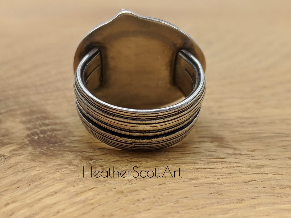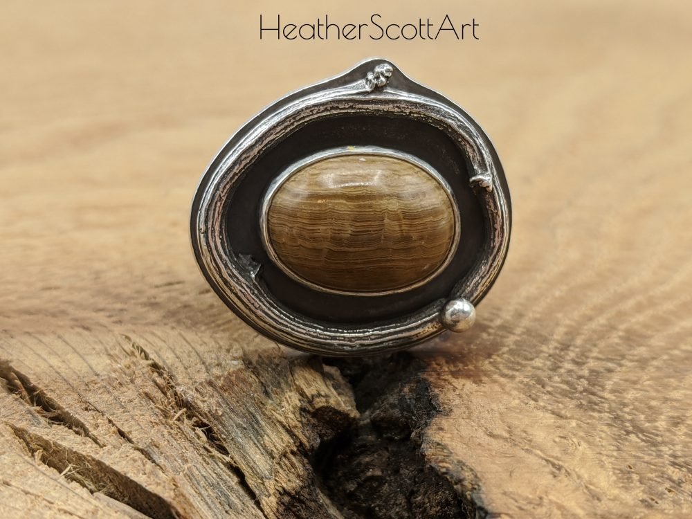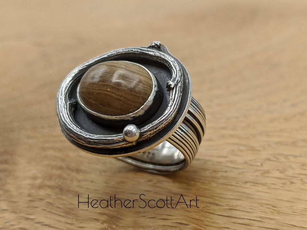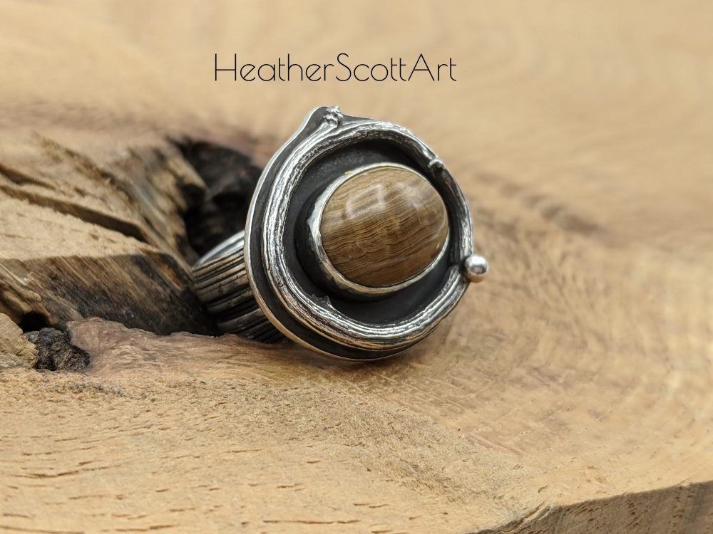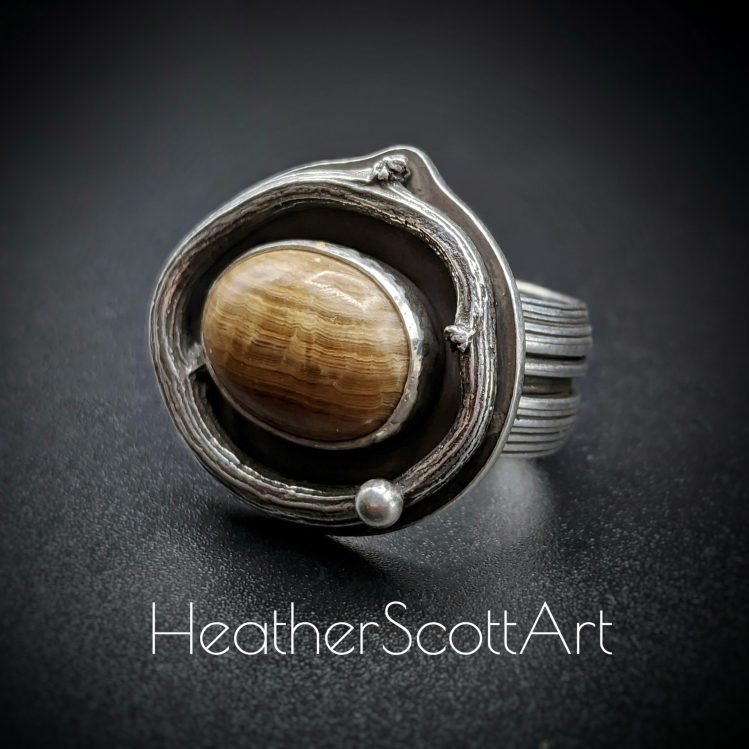 Handmade by Heather Scott, this one-of-a-kind ring features a natural agate cabochon with delicate linear patterns that mirror the textured mitsuro band. A cast plum tree branch wraps around the stone, accented with a polished silver dew drop for a touch of light. Crafted in solid sterling silver, the ring highlights the organic flow and natural beauty created through traditional jewelry fabrication and Japanese mitsuro techniques. Read about the mitsuro process in the about page.