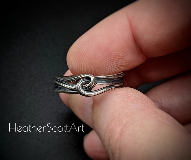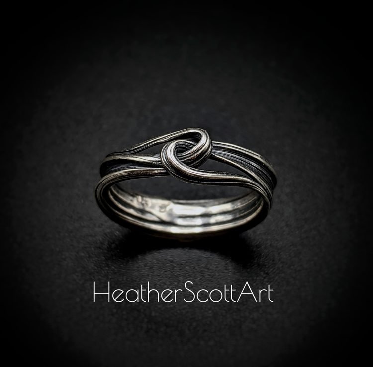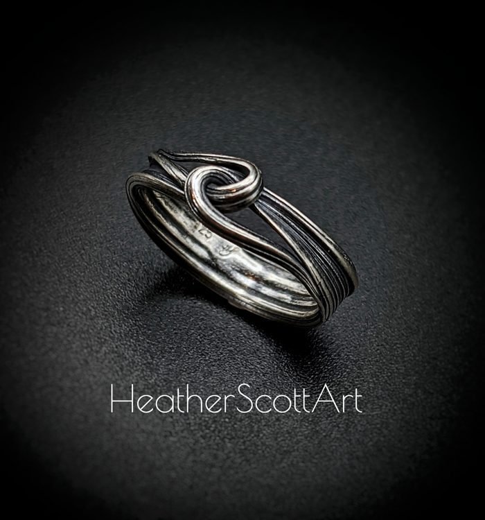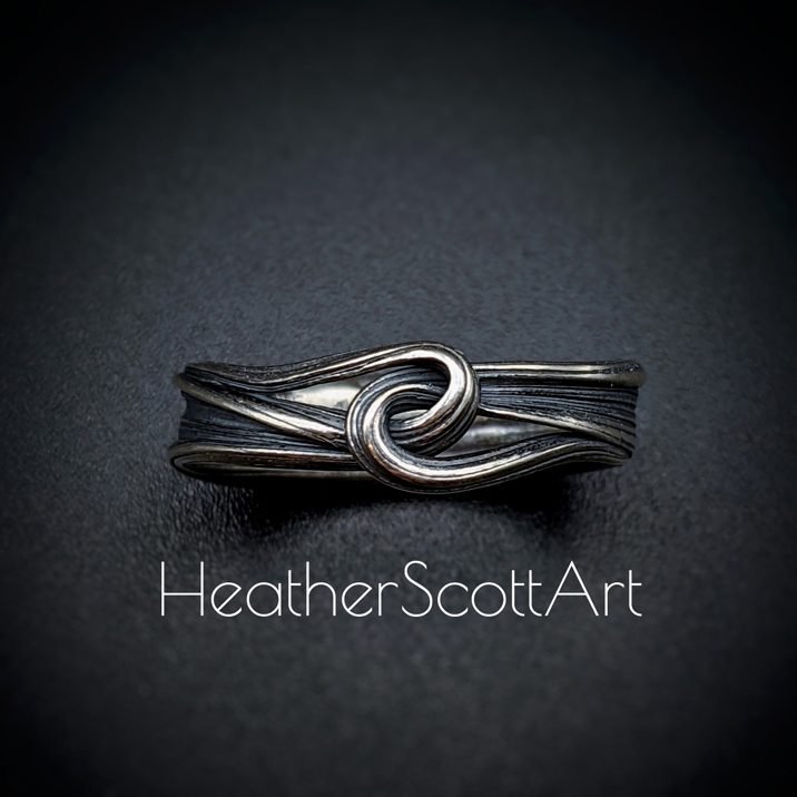 This mitsuro knot ring features flowing horizontal textures in a wrap around design. This size 7 ring is handmade in sterling silver by Heather Scott.