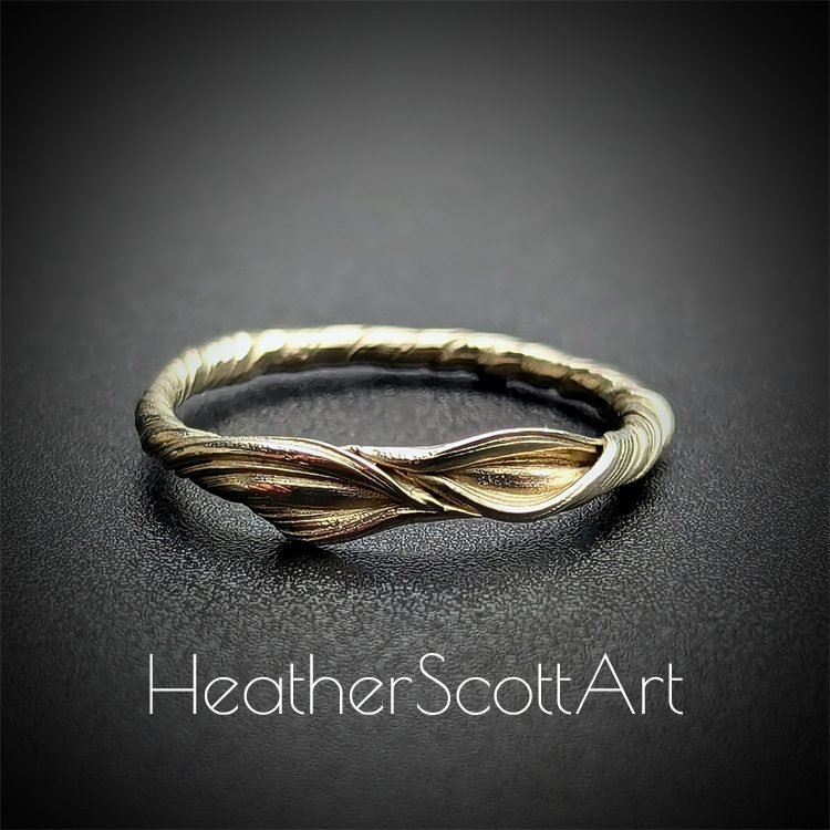 This ring is handcrafted by Heather Scott using the Japanese technique of mitsuro. Known for its ability to produce fluid, organic textures, this process gives the ring its distinctive flowing linear texture and timeless aesthetic. Its minimalist yet striking design makes it perfect for any occasion, whether worn alone or with other favorites.