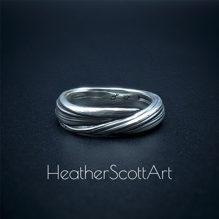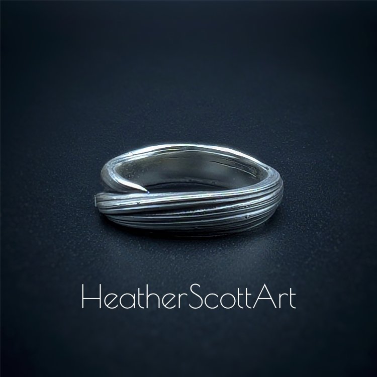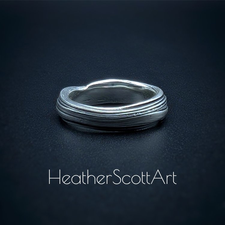Handmade by Heather Scott, this elegant ring band showcases the timeless beauty of the Japanese mitsuro technique, celebrated for its flowing, organic lines. The band’s linear textured surface (called hikime) adds depth and movement, enhanced by a striking contrast finish that highlights the intricate details. Read about the mitsuro process in the about page.