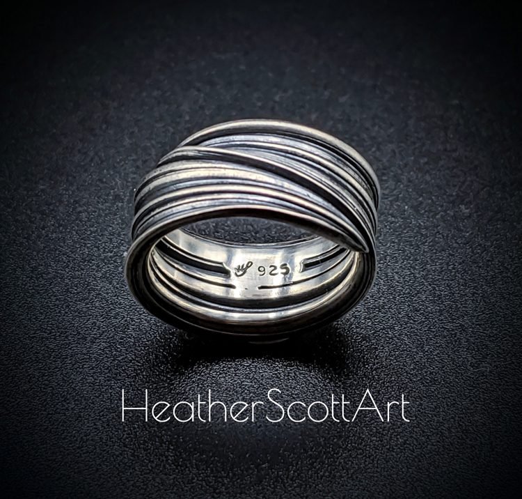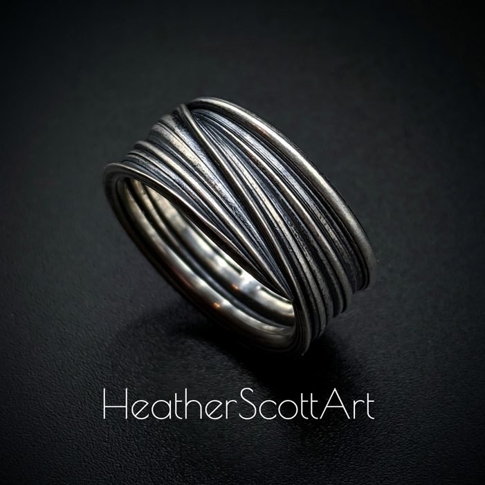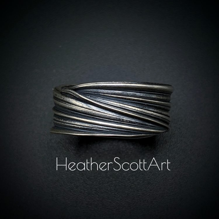 Handmade by Heather Scott, this elegant ring band showcases the timeless beauty of the Japanese mitsuro technique, celebrated for its flowing, organic lines. The band’s linear textured surface (called hikime) adds depth and movement, enhanced by a striking contrast finish that highlights the intricate details. Read about the mitsuro process in the about page.