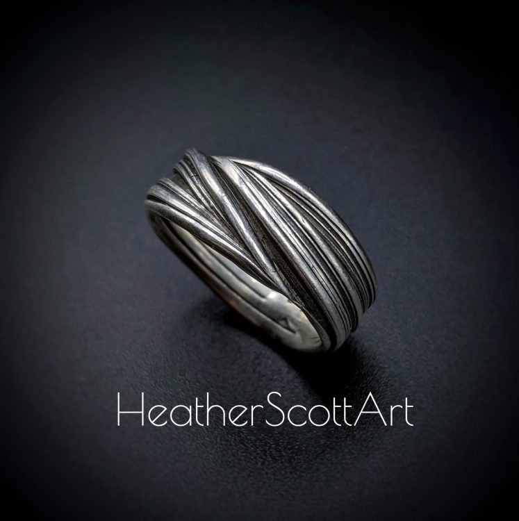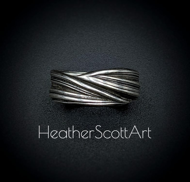 Handmade by Heather Scott, this beautiful sterling silver mitsuro band features a wrap around design with linear textures and a contrast finish.
