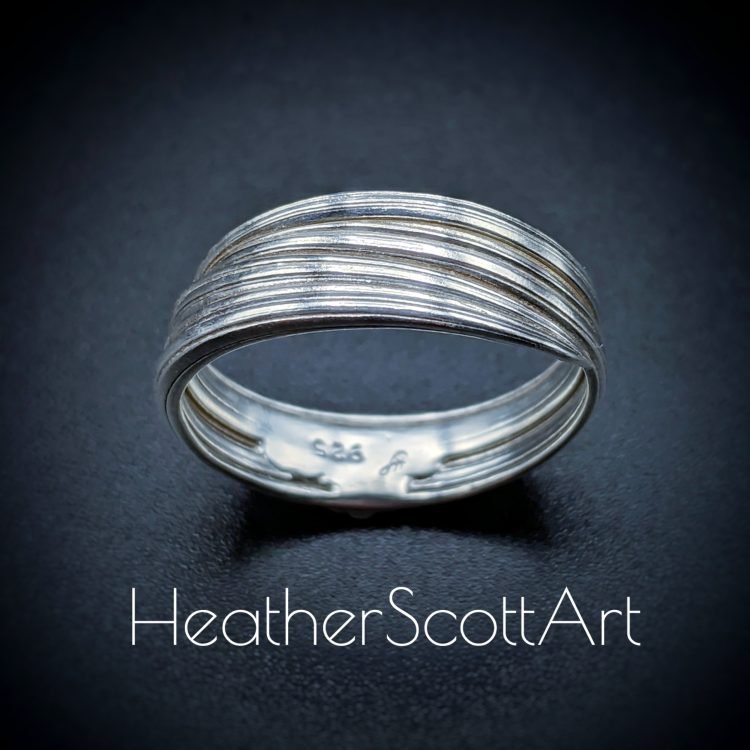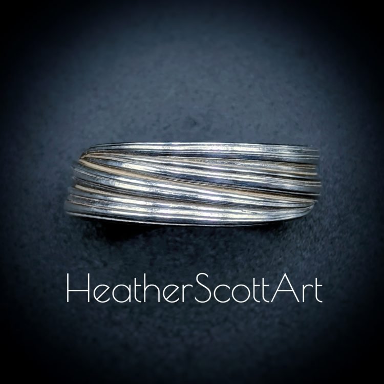Handmade by Heather Scott, this elegant ring band showcases the timeless beauty of the Japanese mitsuro technique, celebrated for its flowing, organic lines. The band’s linear textured surface (called hikime) adds depth and movement, enhanced by a striking contrast finish that highlights the intricate details. Read about the mitsuro process in the about page.