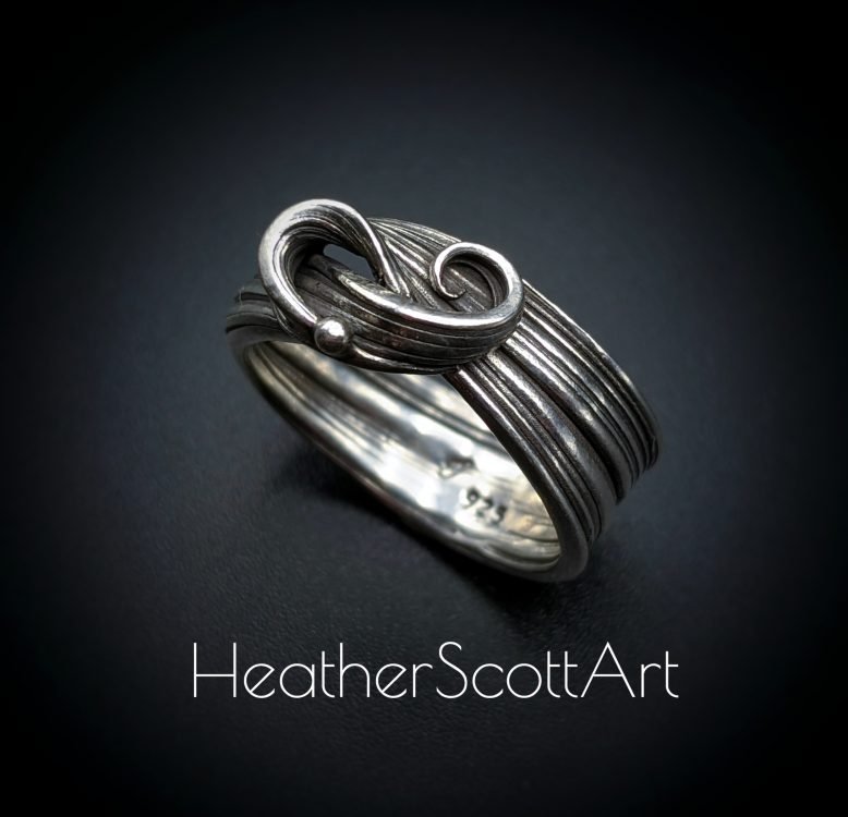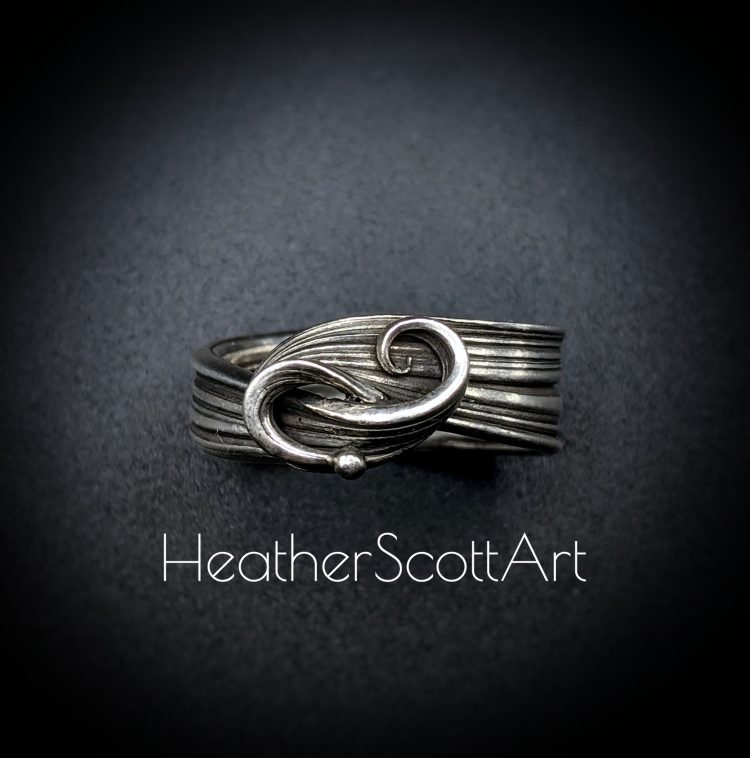 This ring is handcrafted by Heather Scott using the Japanese technique of mitsuro. Known for its ability to produce fluid, organic textures, this process gives the ring its distinctive flowing linear texture and timeless aesthetic. Its minimalist yet striking design makes it perfect for any occasion, whether worn alone or with other favorites.