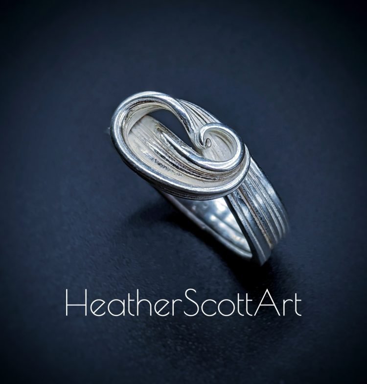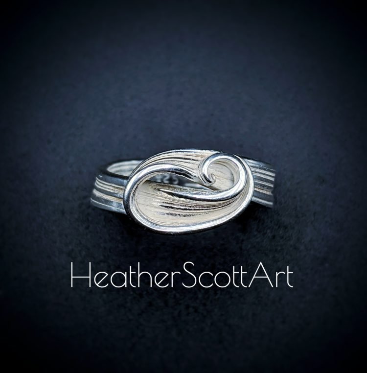 This mitsuro wave ring features a wrap around horizontal linear textured band design. Handmade in sterling silver in ring size 6.5.
